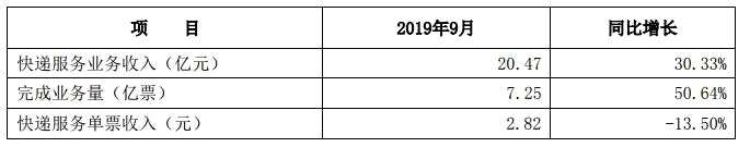 【申通快遞(002468)、股吧】(002468)10月18日晚間發(fā)布申通快遞股份有限公司2019年9月經營簡報,9月快遞服務業(yè)務收入20.47億元,同比增長30.33%;完成業(yè)務量7.25億票,同比增長50.64%;快遞服務單票收入2.82元,同比下滑13.5%。