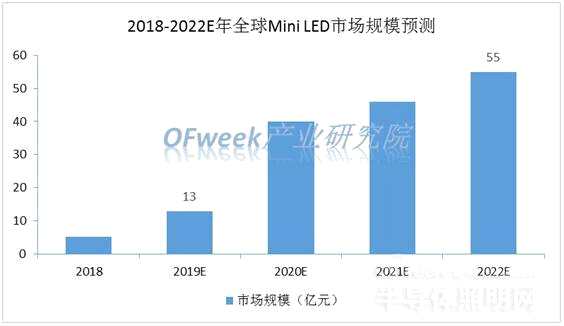 在眾多廠家推動下,當(dāng)前MiniLED顯示技術(shù)和產(chǎn)品日趨成熟,產(chǎn)品應(yīng)用也逐漸增多,市場規(guī)模也不斷擴大。據(jù)OFweek產(chǎn)業(yè)研究院數(shù)據(jù),2018年全球MiniLED市場規(guī)模約5.2億元,雖然整體規(guī)模還較小,但隨著Mini LED逐步導(dǎo)入產(chǎn)業(yè)應(yīng)用并開始加速,尤其是高階顯示器應(yīng)用,2019年MiniLED市場需求開始起飛,未來兩三年MiniLED市場前景廣闊,預(yù)計2022年市場規(guī)模達55億元。