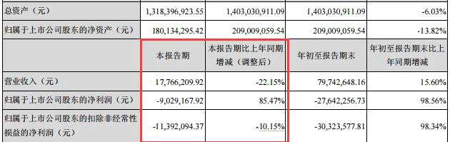 2019年三季報顯示,報告期末,天山生物的總資產(chǎn)為13.18億元,較上年末下滑6.03%,凈資產(chǎn)為1.8億元,較上年末下滑13.82%。歸屬于上市公司股東的凈利潤虧損2764萬元,扣非后的凈利潤虧損3032萬元,三季度內(nèi),公司實現(xiàn)營業(yè)收入1776萬元,同比下降22.15%。