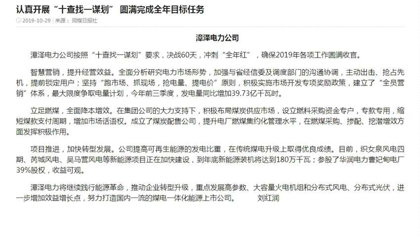 【漳澤電力(000767)、股吧】(000767)公司按照“十查找一謀劃”目標(biāo)要求,決戰(zhàn)60天,沖刺“全年紅”,確保2019年圓滿收官。