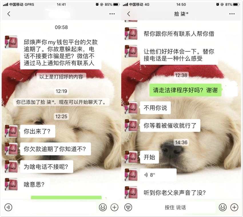 在邱先生提出通過(guò)法律途徑解決后,對(duì)方表示:“不用你說(shuō),等著被催收吧”,隨后,對(duì)方發(fā)來(lái)邱先生父親的一段語(yǔ)音,并說(shuō):“聽(tīng)到你老父親的聲音沒(méi)?”