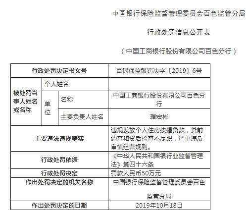 工行百色分行被罰50萬:違規(guī)發(fā)放個人住房按揭貸款