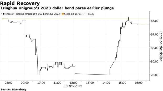 由于上周五(11.1)彭博社的兩篇報道,第一篇波動時說了下跌,紫光召開投資人電話會議后,市場信心立刻上漲,于是彭博立刻更新了另一篇報道,指出“止跌回升”,紫光的境外債已經(jīng)回復(fù)到正常水平,這也印證了紫光集團聲明的準確性: