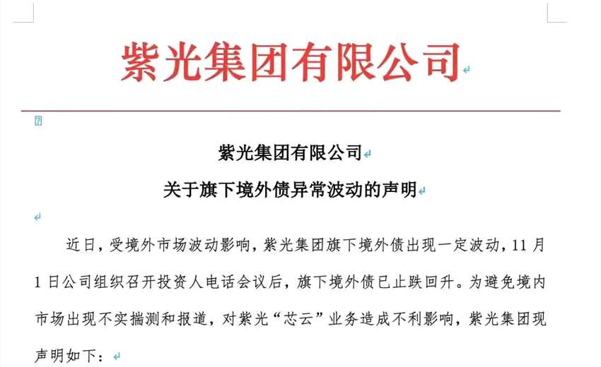 11月6日,紫光集團在官方網(wǎng)站發(fā)表《關(guān)于旗下境外債異常波動的聲明》,全文如下:
