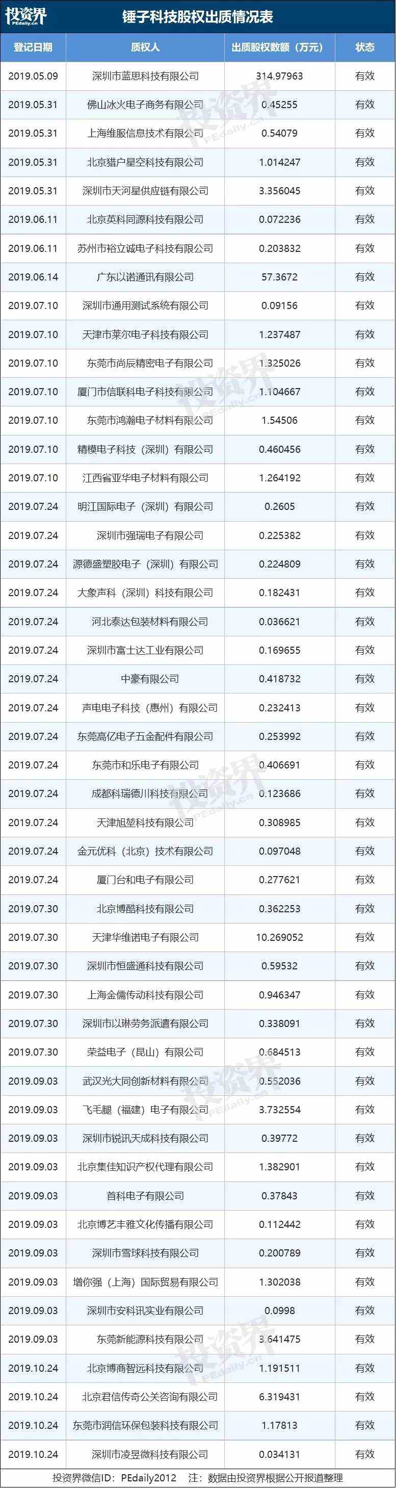 據(jù)企查查數(shù)據(jù)顯示,從今年5月起至今,錘子科技陸續(xù)新增股權(quán)出質(zhì)信息,出質(zhì)人均為羅永浩,質(zhì)權(quán)人中則包括電子科技公司、新能源科技公司、材料公司、文化傳播公司以及公關(guān)公司等等共49家公司,出質(zhì)股權(quán)數(shù)額從幾百塊到幾百萬(wàn)不等。