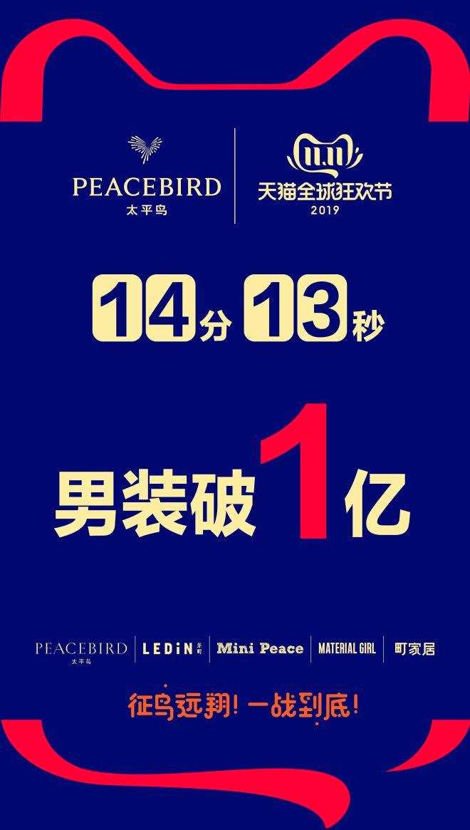 2019太平鳥雙11戰(zhàn)報:14分13秒男裝破億