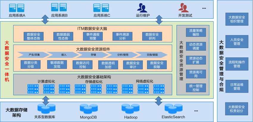 為了保障大數(shù)據(jù)資產(chǎn)和大數(shù)據(jù)系統(tǒng)的安全,傳統(tǒng)方法中,需要部署數(shù)據(jù)訪問控制、脫敏、加密、審計、脆弱性掃描、敏感數(shù)據(jù)發(fā)現(xiàn)等多種硬件設(shè)備或軟件模塊。部署成本高,實施周期長,并且難以橫向擴展。同時,各數(shù)據(jù)安全設(shè)備、模塊間,數(shù)據(jù)保護策略規(guī)則同步困難,日志難以集中分析,無法通過關(guān)聯(lián)分析發(fā)現(xiàn)潛在的數(shù)據(jù)安全問題,也不能對數(shù)據(jù)安全態(tài)勢進行集中呈現(xiàn),無法為下一步數(shù)據(jù)安全建設(shè)提供支撐。安全建設(shè)的碎片化,使得數(shù)據(jù)安全技術(shù)手段部署運維困難,難以有效運轉(zhuǎn),導(dǎo)致數(shù)據(jù)安全建設(shè)目標難以達成。
