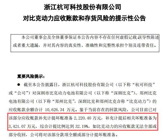 杭可科技11月10日晚發(fā)布公告,公司對深圳市比克動力電池有限公司(深圳比克)、鄭州比克電池有限公司(鄭州比克,深圳比克和鄭州比克合稱“比克動力”)的應(yīng)收賬款余額合計(jì)1.06億元。鑒于當(dāng)前存在的回款風(fēng)險(xiǎn),公司目前已對該部分應(yīng)收賬款補(bǔ)充計(jì)提壞賬準(zhǔn)備2220.40萬元,補(bǔ)充計(jì)提后相關(guān)壞賬準(zhǔn)備為3421.07萬元,綜合計(jì)提比例達(dá)到32.19%,如比克動力的應(yīng)收賬款無法全部或部分收回,公司將對該部分款項(xiàng)全額或部分計(jì)提壞賬準(zhǔn)備。