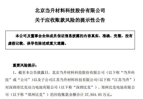 11月7日晚間,當(dāng)升科技就曾發(fā)布了關(guān)于應(yīng)收賬款風(fēng)險(xiǎn)的提示性公告,當(dāng)升科技以及子公司江蘇當(dāng)升材料科技有限公司對深圳比克、鄭州比克的應(yīng)收賬款余額合計(jì)3.79億元,上述應(yīng)收賬款仍存在無法收回的風(fēng)險(xiǎn)。