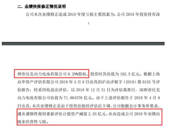 2019年4月15日,中利集團(tuán)披露《2018年度業(yè)績快報(bào)修正公告》,對2019年2月26日披露的業(yè)績快報(bào)數(shù)據(jù)進(jìn)行修正,預(yù)計(jì)歸母凈利潤由盈利3088.75萬元修正為虧損2.83億元。業(yè)績修正的主要原因,就包括公司對持有的深圳市比克動力電池有限公司8.29%的股權(quán)補(bǔ)充計(jì)提2.55億元資產(chǎn)減值。