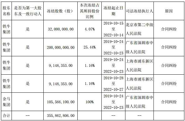 11月6日,眾泰汽車公告顯示,因合同糾紛,公司控股股東鐵牛集團(tuán)持有上市公司的2.5億股股份被司法凍結(jié),一致行動人金馬集團(tuán)(000602)持有的1.06億股股份也被司法凍結(jié),合計(jì)凍結(jié)股份達(dá)到3.56億股,占上市公司總股本的比例達(dá)到了17.55%。