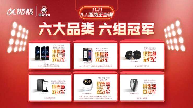 據(jù)天貓、京東雙平臺榜單顯示,科大訊飛此次雙十一共獲六大品類冠軍。雙11期間(11月1日到11月11日)銷售額同比增長128%,11日當(dāng)日銷售額同比增長116%。其中,訊飛翻譯機(jī)獲天貓、京東雙平臺翻譯機(jī)品類和單品銷售額連續(xù)三年雙冠軍,同比增長100%以上。