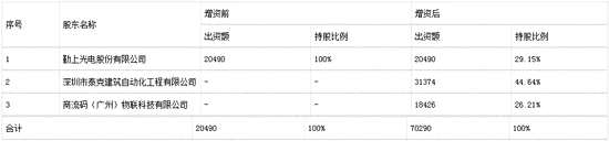 增資完成后,煜光照明注冊(cè)資本將由20,490萬(wàn)元增加至70,290萬(wàn)元,泰克建筑將持有煜光照明44.64%股權(quán),物聯(lián)科技將持有煜光照明26.21%股權(quán),勤上光電對(duì)其持股比例由100%下降至29.15%,煜光照明不再納入勤上股份的合并報(bào)表范圍。