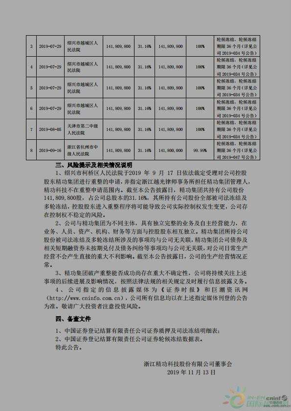 近日,【精功科技(002006)、股吧】(002006)發(fā)布公告稱,2019年11月12日,公司通過中國證券登記結(jié)算有限責任公司深圳分公司系統(tǒng)查詢,獲悉公司控股股東精功集團前期被上海金融法院司法凍結(jié)的1.4181億股公司股份(占公司總股本31.16%)已全部解除凍結(jié),原因系精功集團進入司法重整,精功集團管理人向上海金融法院申請解除對精功集團財產(chǎn)的保全措施。