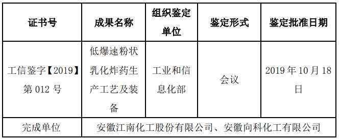 江南化工及控股子公司獲得科學(xué)技術(shù)成果鑒定證書