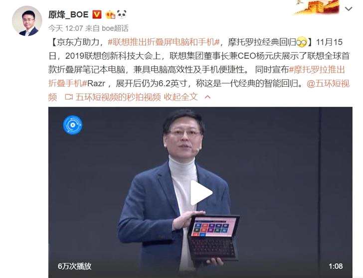 摘要: 11月15日消息在今天舉行的2019聯(lián)想創(chuàng)新科技大會(huì)上,聯(lián)想在國內(nèi)發(fā)布了折疊屏筆記本ThinkPadX1和折疊屏手機(jī)摩托羅拉Razr2019。京東方集團(tuán)(600811)副總裁原烽在微博透露,聯(lián)想折疊屏