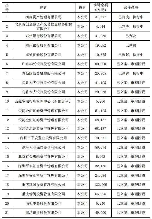 互聯(lián)網(wǎng)北京11月19日訊(記者韓藝嘉 華青劍)11月16日,【安信信托(600816)、股吧】(600816)(600816.SH)發(fā)布訴訟公告,公司受讓信托計(jì)劃受益權(quán)及承擔(dān)相關(guān)訴訟費(fèi)用合計(jì)約84.7億元,其中已判決案件的金額10.2億元,達(dá)成和解的案件金額9.1億元,尚在審理中的案件金額65.4億元。