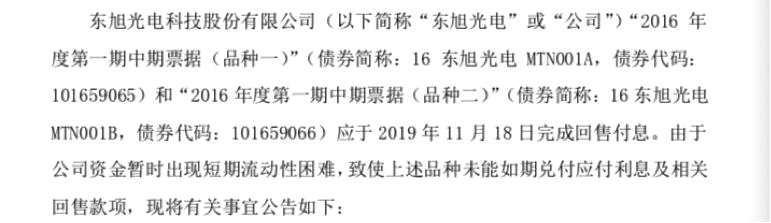 但僅數(shù)日后,11月18日,東旭光電發(fā)布公告稱,公司多只中期票據(jù)應(yīng)于2019年11月18日完成回售付息,由于東旭光電資金暫時出現(xiàn)短期流動性困難,致使上述品種未能如期兌付應(yīng)付利息及相關(guān)回售款項。