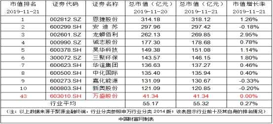 截至11月21日收盤,萬盛股份市值41億元,位列行業(yè)第43,今日市值增長0.00%,行業(yè)平均上漲0.27%。下表是行業(yè)內(nèi)上市公司市值變化情況明細(xì):