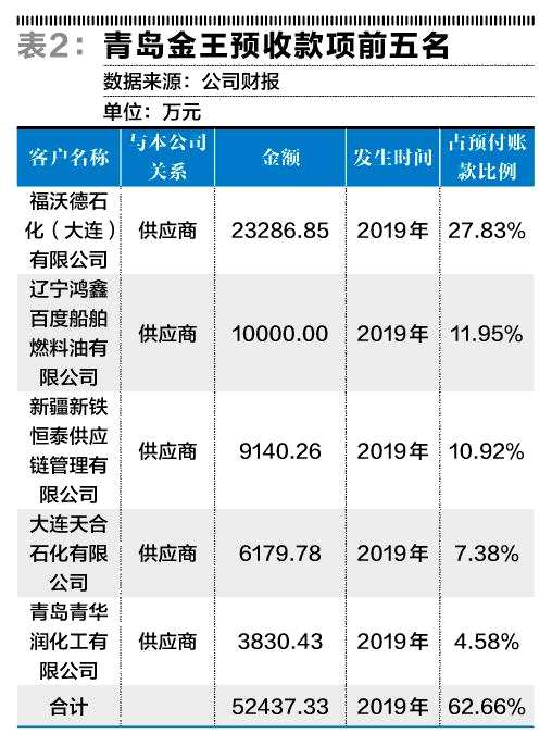 公司2019年上半年的營業(yè)收入下降,營業(yè)成本與上年差不多,而預(yù)付款項卻從2018年年末的4億元增加至8.37億元。前五名預(yù)付款項情況:福沃德石油(大連)有限公司(下稱“福沃德”)2.33億元、遼寧鴻鑫百度船舶燃料油有限公司(下稱“遼寧鴻鑫”)1億元、新疆新鐵恒泰供應(yīng)鏈管理有限公司(下稱“新疆新鐵”)9140.26萬元、大連天合石化有限公司(下稱“大連天合”)6179.78萬元、青島青華潤化工有限公司(下稱“青島青華潤”)3830.43萬元,合計5.24億元,占比62.66%。
