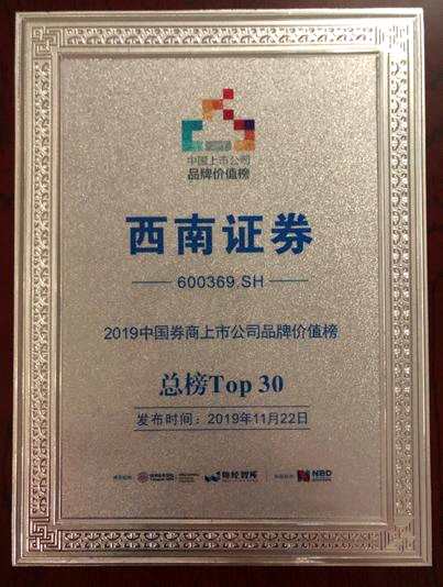 西南證券獲“2019中國(guó)證券業(yè)上市公司品牌價(jià)值榜”TOP30