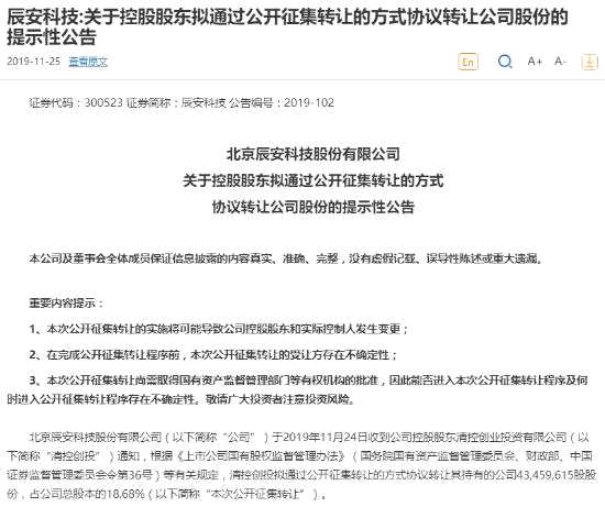 根據(jù)辰安科技11月25日披露的公告顯示,公司控股股東清控創(chuàng)投擬通過公開征集轉(zhuǎn)讓的方式,協(xié)議轉(zhuǎn)讓其全部持有的公司4346萬股股份,占公司總股本的18.68%,若本次公開征集轉(zhuǎn)讓獲得批準(zhǔn)并得以實(shí)施,將導(dǎo)致公司控股股東和實(shí)際控制人發(fā)生變更。