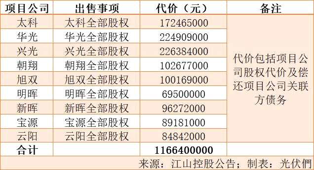 11月27日,江山控股發(fā)布公告,于2019年11月15日(聯(lián)交所交易時(shí)段后),其全資附屬公司江山永泰、項(xiàng)目公司(太科、華光、興光、朝翔、旭雙、明暉、新暉、寶源、云陽)與買方中核山東能源有限公司訂立出售協(xié)議,江山永泰有條件同意向買方出售項(xiàng)目公司(共持有10個(gè)光伏電站項(xiàng)目)全部股權(quán),總代價(jià)約1,166,400,000元。