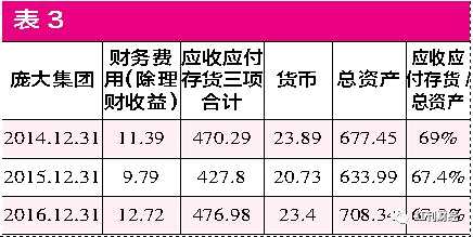 再看表3龐大集團2014、2015和2016三年報表,就能更加清楚認(rèn)識到大存大貸,如果應(yīng)收應(yīng)付存貨加財務(wù)費用飆升,那么爆雷就是必然的??待嫶蠹瘓F2014年年報就知道該公司地雷很大,該公司能扛到2017年爆雷實屬不易。