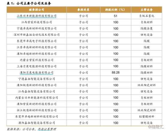 公司旗下有眾多全資子公司,重要的子公司有:江西紫宸負(fù)責(zé)負(fù)極材料業(yè)務(wù);深圳新嘉拓、江西嘉拓、寧德嘉拓負(fù)責(zé)鋰電設(shè)備業(yè)務(wù);東莞卓高、寧德卓高、江蘇卓高、負(fù)責(zé)鋰電池隔膜業(yè)務(wù);東莞卓越、香港安勝負(fù)責(zé)鋁塑包裝膜業(yè)務(wù);浙江極盾負(fù)責(zé)納米陶瓷材(涂覆材料)、業(yè)務(wù)。