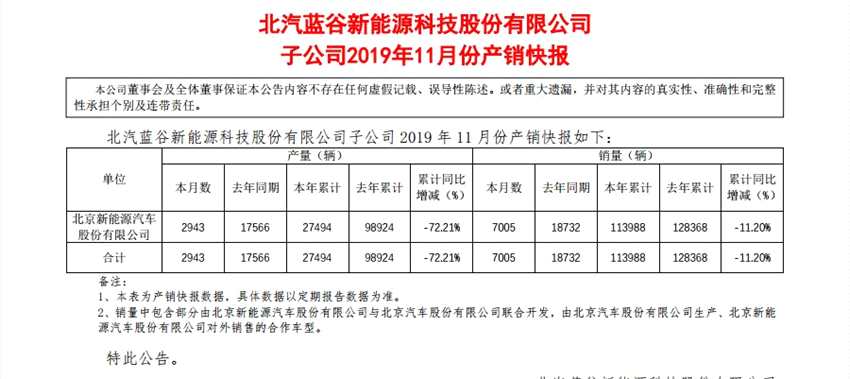12月9日, 【北汽藍谷(600733)、股吧】(600733) 旗下子公司北汽新能源發(fā)布2019年11月份的產(chǎn)銷快報。報告顯示,北汽新能源11月份實現(xiàn)銷售7005輛,而去年同期18732輛同比下滑62.6%;今年1-11月累計銷量為113988輛,與去年同期的累計銷量123988輛,同比下滑11.20%。