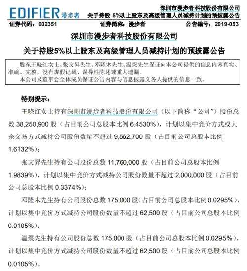 漫步者發(fā)布的減持預披露公告顯示,公司董事王曉紅、董事兼副總裁張文昇,以及兩位副總裁鄧隆木和溫煜擬計劃分別減持占漫步者總股本1.6132%、0.3374%、0.0105%、0.0105%的股票,合計減持比例為1.9716%。