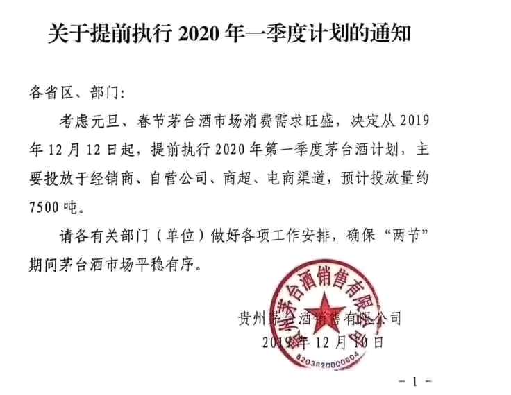 茅臺(tái)通知經(jīng)銷(xiāo)商提前執(zhí)行2020年一季度計(jì)劃。