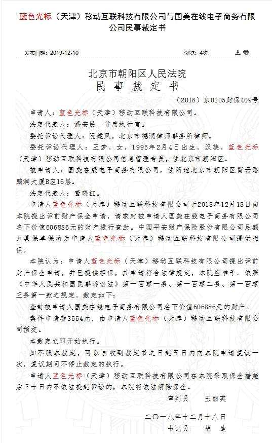 中國(guó)網(wǎng)科技12月12日訊 據(jù)中國(guó)裁判文書(shū)網(wǎng)消息,近日,北京市朝陽(yáng)區(qū)人民法院曾受理【藍(lán)色光標(biāo)(300058)、股吧】(300058)(天津)移動(dòng)互聯(lián)科技有限公司訴前財(cái)產(chǎn)保全申請(qǐng),請(qǐng)求對(duì)被申請(qǐng)人國(guó)美在線電子商務(wù)有限公司名下價(jià)值60余萬(wàn)元的財(cái)產(chǎn)進(jìn)行查封。