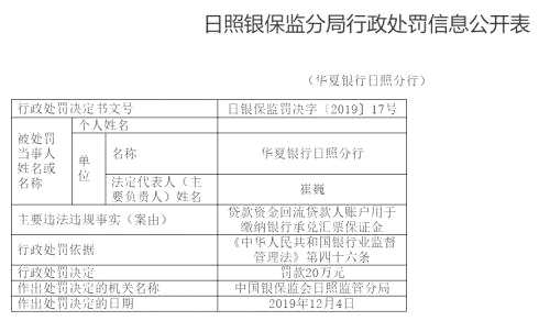華夏銀行被罰20萬:貸款資金回流貸款人賬戶