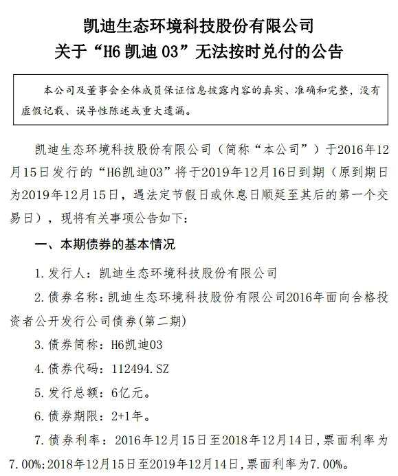 12月13日,*ST凱迪(000939)公告稱,因公司資金周轉(zhuǎn)困難,不能按期兌付H6凱迪03的本金及債券利息,“H6凱迪03”無(wú)法按時(shí)兌付。