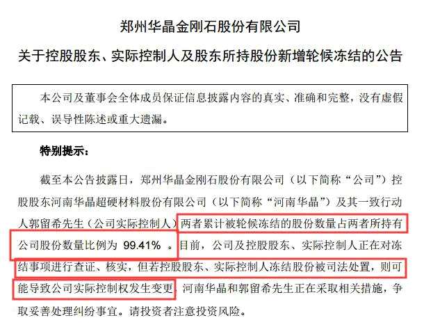 12月3日,豫金剛石公告稱,公司控股股東河南華晶超硬材料股份有限公司(以下簡稱“河南華晶”)及其一致行動人郭留希(公司實控人)兩者累計被輪候凍結(jié)的股份數(shù)量占兩者所持有公司股份數(shù)量比例為99.41%。若控股股東、實際控制人凍結(jié)股份被司法處置,則可能導(dǎo)致公司實際控制權(quán)發(fā)生變更。