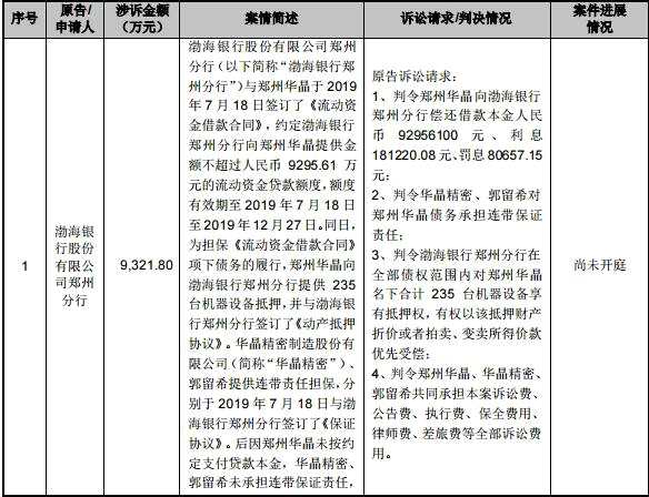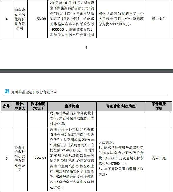公告顯示,豫金剛石被渤海銀行鄭州分行、焦作中旅銀行、中原小貸、湖南隆泰環(huán)保能源科技有限公司、濟(jì)南市冶金科學(xué)研究所起訴,涉訴金額分別為9321.80萬元、5000萬元、4405.62萬元、56.98萬元、224.59萬元。