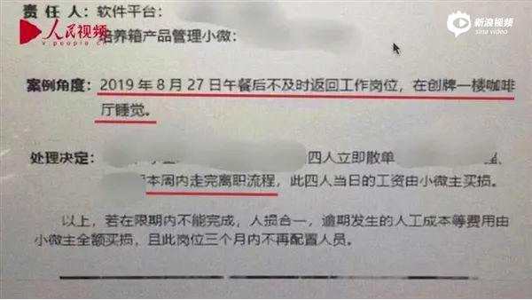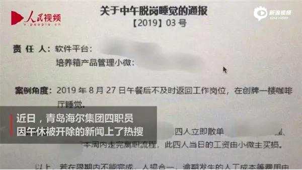 2019年9月,根據(jù)曝光的一份海爾集團(tuán)文件“關(guān)于中午脫崗睡覺(jué)的通報(bào)”,8月27日午餐后,4名員工未及時(shí)返回工作崗位,在咖啡廳內(nèi)睡覺(jué),公司決定4人立即散單,而且必須當(dāng)周內(nèi)走完離職流程,當(dāng)日工資由小微主買(mǎi)損。