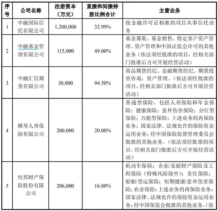 支撐中植系資本版圖擴(kuò)張的,則是其掌控的一系列金融機(jī)構(gòu)。解直錕直接持有或控制達(dá)到5%以上的共有中融信托、中融基金、中融期貨、橫琴人壽、恒邦財(cái)險(xiǎn)5家,其中最核心的便是解直錕持股比例達(dá)32.99%的中融信托。