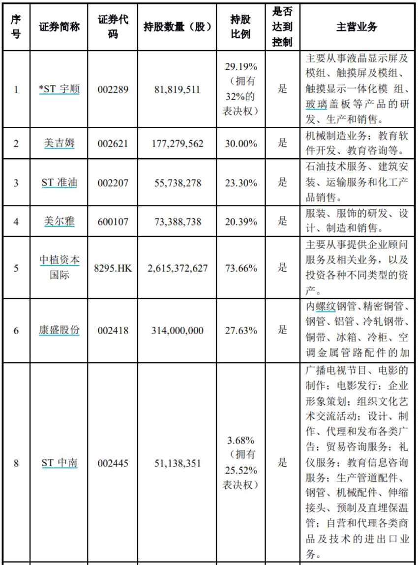 同時(shí),中植系還持有超華科技(002288)、鼎龍股份(300054)、天龍集團(tuán)(300063)、浙江中拓、興業(yè)礦業(yè)(000426)、金洲慈航(000587)、法爾勝(000890)、眾業(yè)達(dá)(002441)、達(dá)華智能(002512)、青島金王(002094)、*ST猛獅(002684)、寶德股份(300023)、*ST美麗(000010)、鞍重股份(002667)、經(jīng)緯輝開(kāi)(300120)、*ST康得(002450)共16家A股上市公司股權(quán),其中7家公司的持股比例超過(guò)10%。