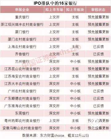 數(shù)據(jù)顯示,截至12日,仍有16家銀行IPO排隊中,均為城商行或農(nóng)商行。