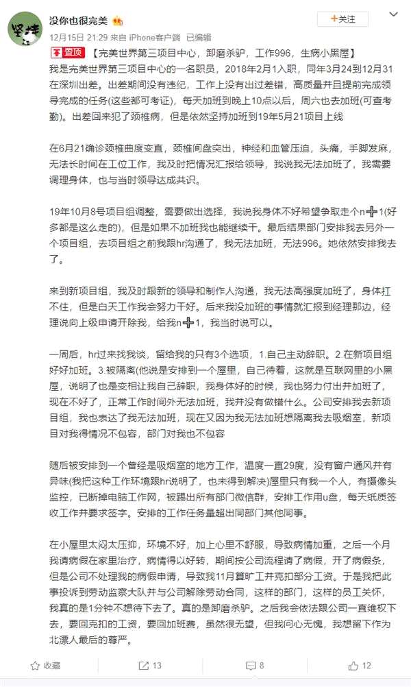 12月15日,自稱完美世界第三項目中心的@沒你也很完美 在微博發(fā)文,控訴完美世界“卸磨殺驢,工作996,生病小黑屋”。