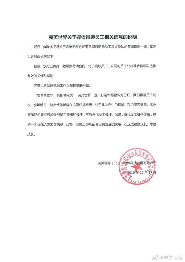 針對網(wǎng)曝暴力裁員一事,12月17日,【完美世界(002624)、股吧】(002624)官微發(fā)布《完美世界關于媒體報道員工相關信息的說明 》。
