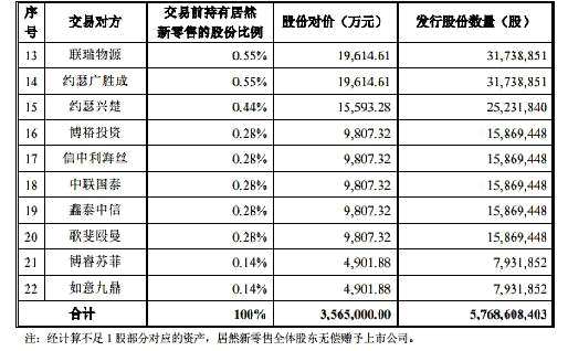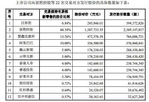 本次發(fā)行股份購買資產的發(fā)行方式為非公開發(fā)行,發(fā)行對象為居然新零售全體股東,具體為汪林朋、居然控股、慧鑫達建材、阿里巴巴、瀚云新領、云鋒五新、泰康人壽、睿通投資、好榮興多、然信投資、紅杉雅盛、信中利建信、聯(lián)瑞物源、約瑟廣勝成、約瑟興楚、博裕投資、信中利海絲、中聯(lián)國泰、鑫泰中信、歌斐毆曼、博睿蘇菲和如意九鼎共 22 名交易對方。