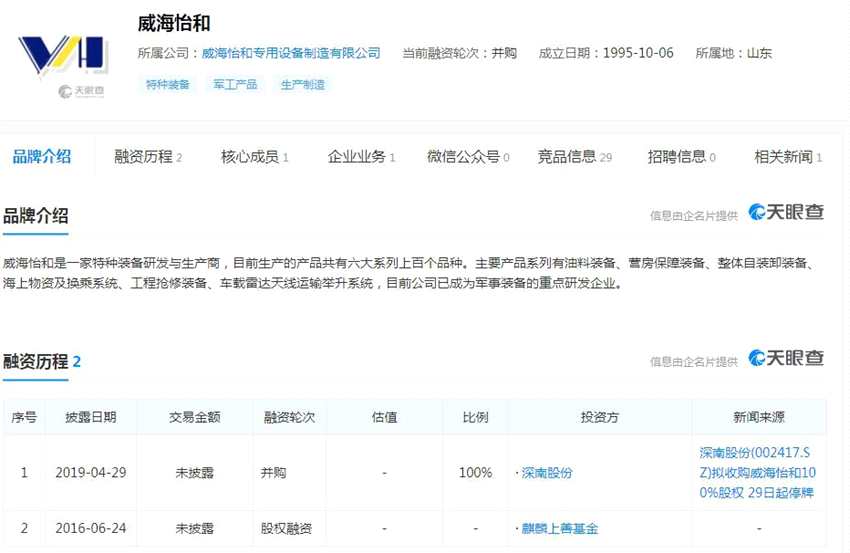 天眼查數(shù)據(jù)顯示,威海怡和是一家特種裝備研發(fā)與生產(chǎn)商,目前生產(chǎn)的產(chǎn)品共有六大系列上百個品種。主要產(chǎn)品系列有油料裝備、營房保障裝備、整體自裝卸裝備、海上物資及換乘系統(tǒng)、工程搶修裝備、車載雷達(dá)天線運(yùn)輸舉升系統(tǒng),目前公司已成為軍事裝備的重點(diǎn)研發(fā)企業(yè)。深南股份曾于2019年4月披露對公司的并購事項(xiàng)。