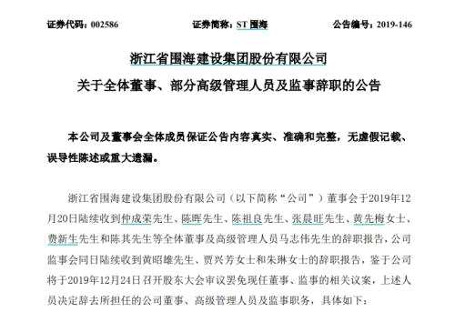 12月20日晚間,ST圍海發(fā)布《關于全體董事、部分高級管理人員及監(jiān)事辭職的公告》。公告顯示,董事會于今日陸續(xù)收到全體董事(7名)、3名監(jiān)事和1名高級管理人員的辭職報告。
