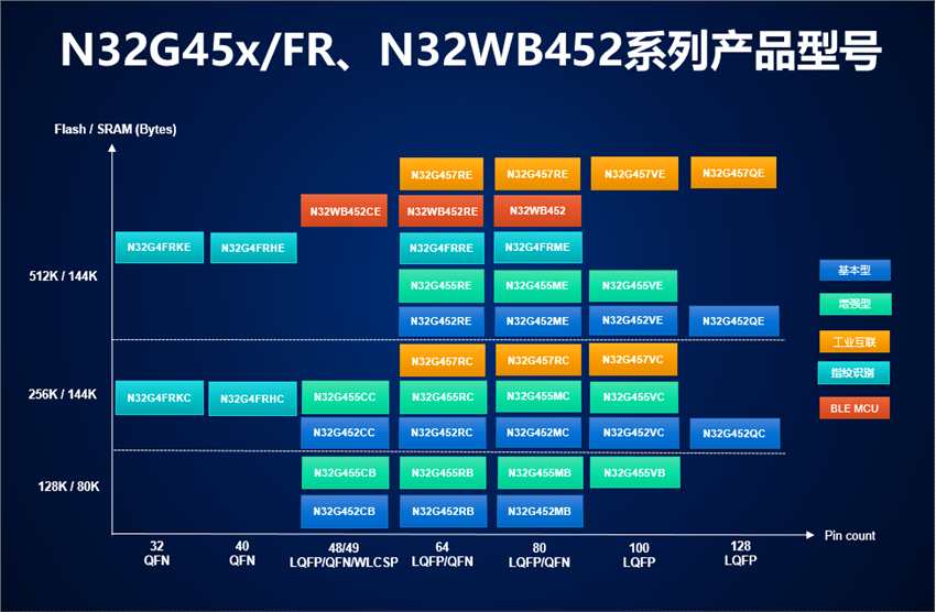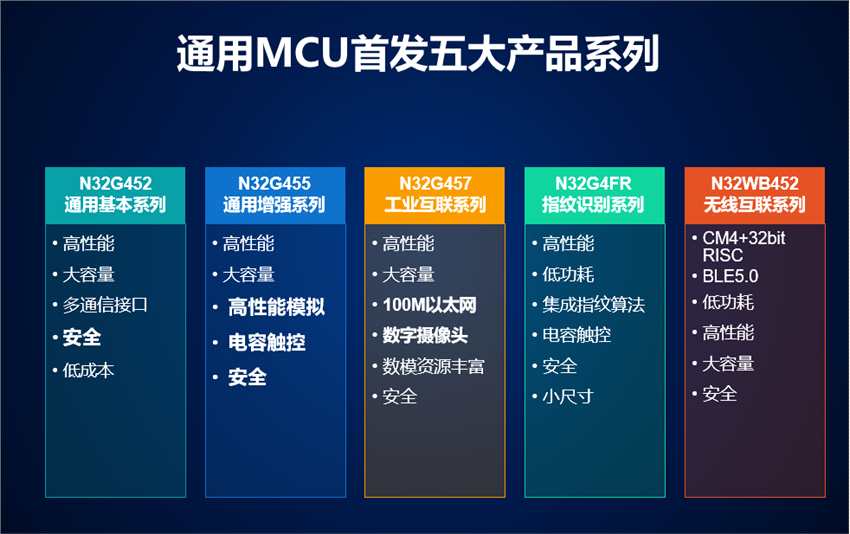 基于該高性能低功耗設(shè)計(jì)平臺(tái),首發(fā)推出N32G452通用基本系列、N32G455通用增強(qiáng)系列、N32G457工業(yè)互聯(lián)系列、N32G4FR指紋識(shí)別系列、N32WB452無(wú)線互聯(lián)系列等五大產(chǎn)品系列共30多款型號(hào)。