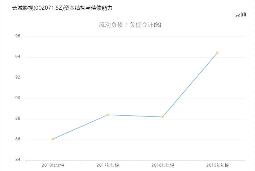大舉并購的現(xiàn)金哪里來呢?自然是大手筆的借款借債。2016年至2018年,長城影視的資產(chǎn)負債率一直高企不下,分別為66.18%、75.7%和82.4%,其中流動負債占總負債的比重一直超過85%。并且長城影視收購形成高商譽風險,長城影視賬面上的商譽值從上市之初的2.73億漲到了13.5億,占總資產(chǎn)的比例超過35%,遠高于行業(yè)平均水平。