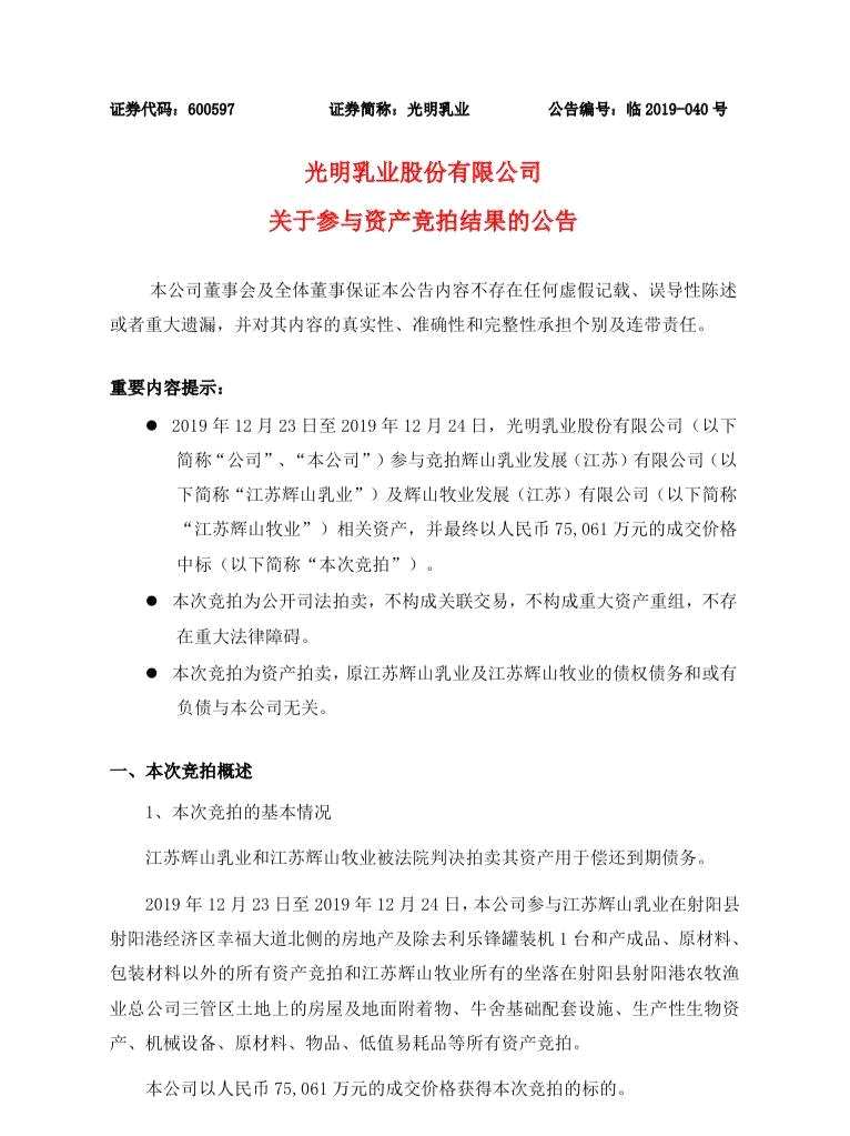 摘要: 12月24日晚間,光明乳業(yè)(600597)股份有限公司(以下簡(jiǎn)稱(chēng)“光明乳業(yè)”)發(fā)布公告稱(chēng),該公司以7.51億元的價(jià)格在公開(kāi)司法拍賣(mài)中,拍得輝山乳業(yè)發(fā)展(江蘇)有限公司(以下簡(jiǎn)稱(chēng)“江蘇輝山乳業(yè)”)以及輝