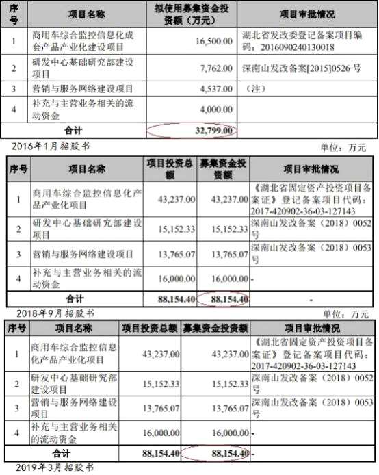 值得一提的是,銳明技術分別于2016年1月、2018年9月、2019年3月發(fā)布共三版招股書,三版招股書中募投項目均相同,其中,2016年1月招股書中募集資金為3.28億元,2018年月、2019年3月兩版招股書中募集資金均為8.82億元。也就是說,在銳明技術2018年9月招股書中,其募集資金已增168.77%。